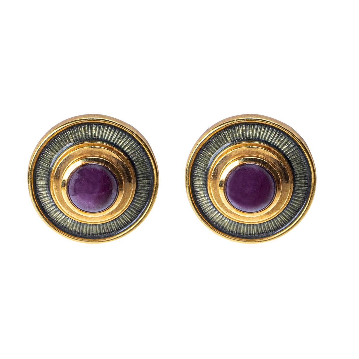 An exquisite pair of signed Leo de Vroomen ear clips, masterfully crafted in 18 karat gold. Each features a luminous cabochon star ruby, measuring approximately 9.3 mm and weighing about 2.0 carats, framed by translucent guilloché enamel in a radiating circular motif. Together the rubies weigh approximately 4.0 carats. With a bold diameter of 1 inch and a substantial weight of 36 grams, these earrings embody de Vroomen’s celebrated fusion of architectural form, vibrant enamel work, and sculptural use of gemstones.