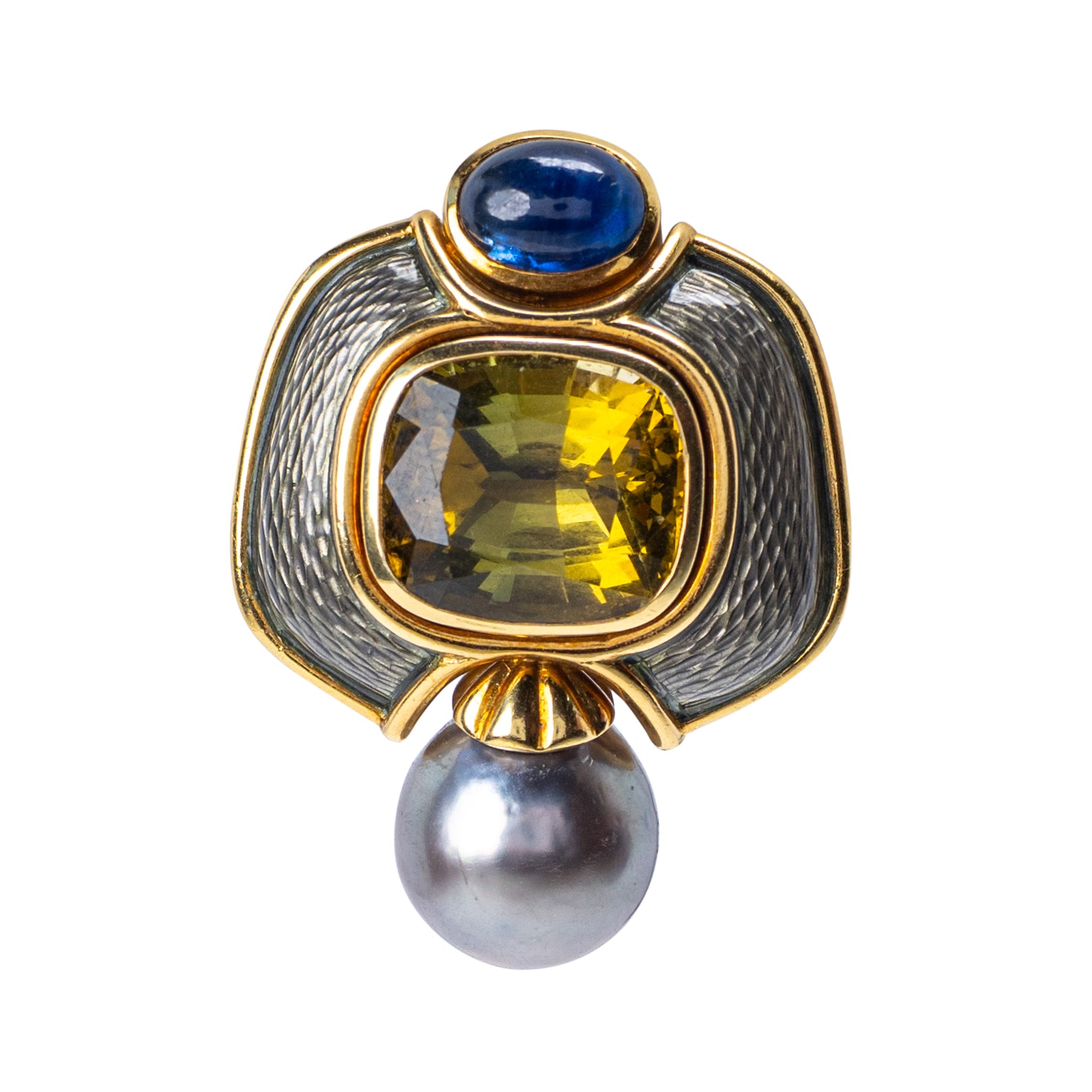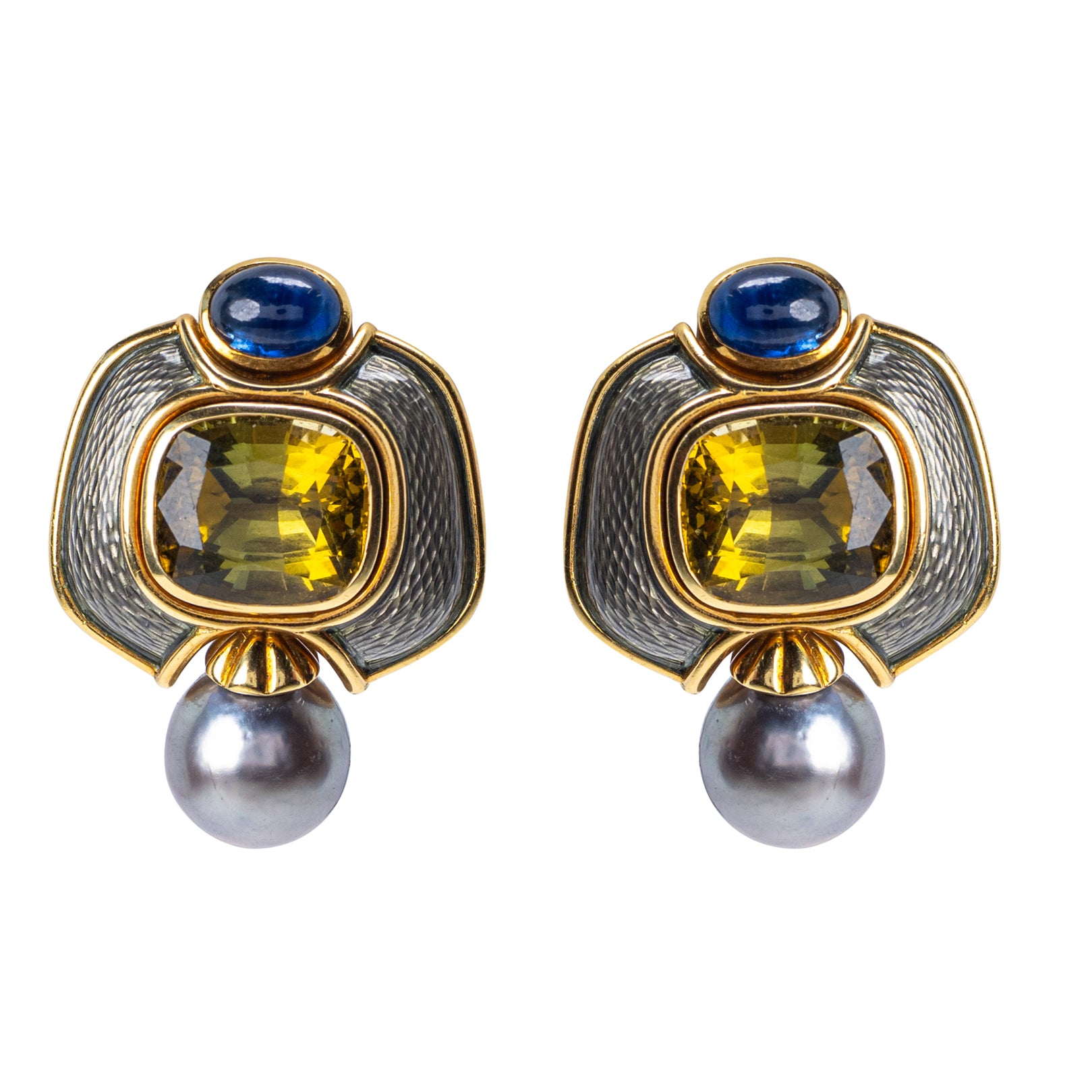 A striking pair of signed Leo de Vroomen ear clips, showcasing the designer’s celebrated fusion of bold geometry and painterly color. Each earring centers on a vivid cushion-cut green tourmaline (~8.5–9.5 carats each) framed in finely textured 18 karat yellow and white gold. Above rests a rich cabochon sapphire, while below hangs a lustrous silvery-grey cultured pearl (approx. 11.5 mm). The result is a jewel that feels both timeless and distinctly modern, reflecting de Vroomen’s artistry as one of London’s most important contemporary goldsmiths.