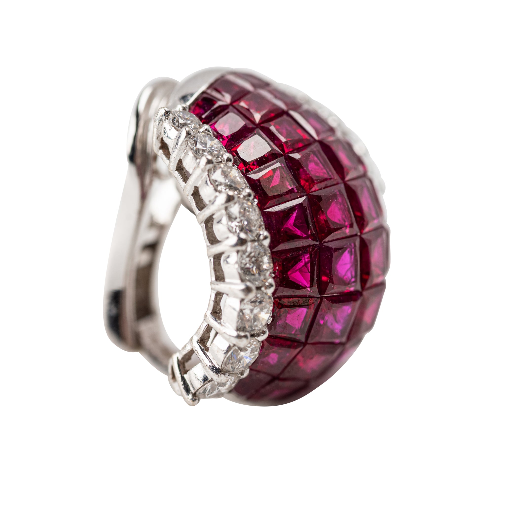 Each ear clip designed as a bombe form, invisibly set with calibré-cut rubies of rich, saturated red, bordered by lines of brilliant-cut diamonds. The rubies are estimated to weigh a total of approximately 18.00–20.00 carats, the diamonds approximately 2.00–2.50 carats. Mounted in 18 karat white gold. Measuring approximately 0.6 in. (1.5 cm). Gross weight 20.4 g. Signed Sabbadini.