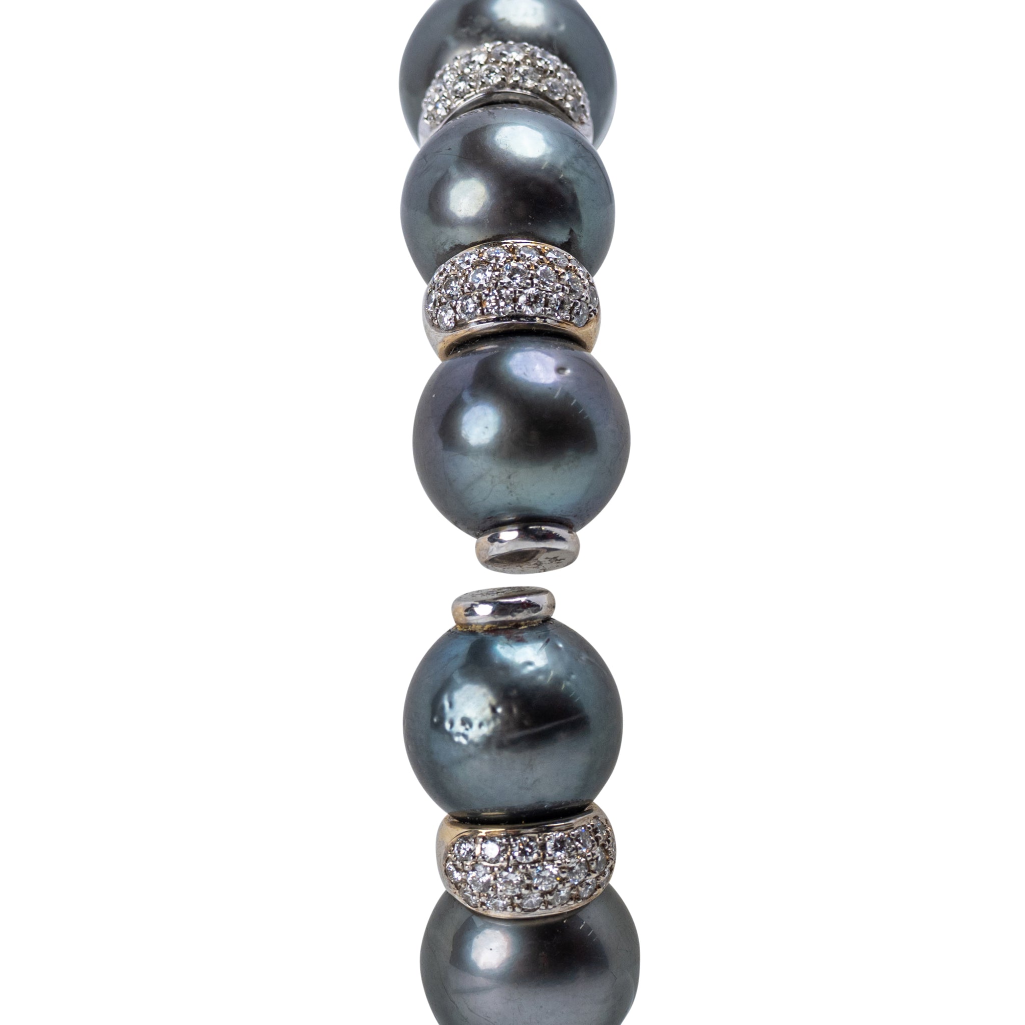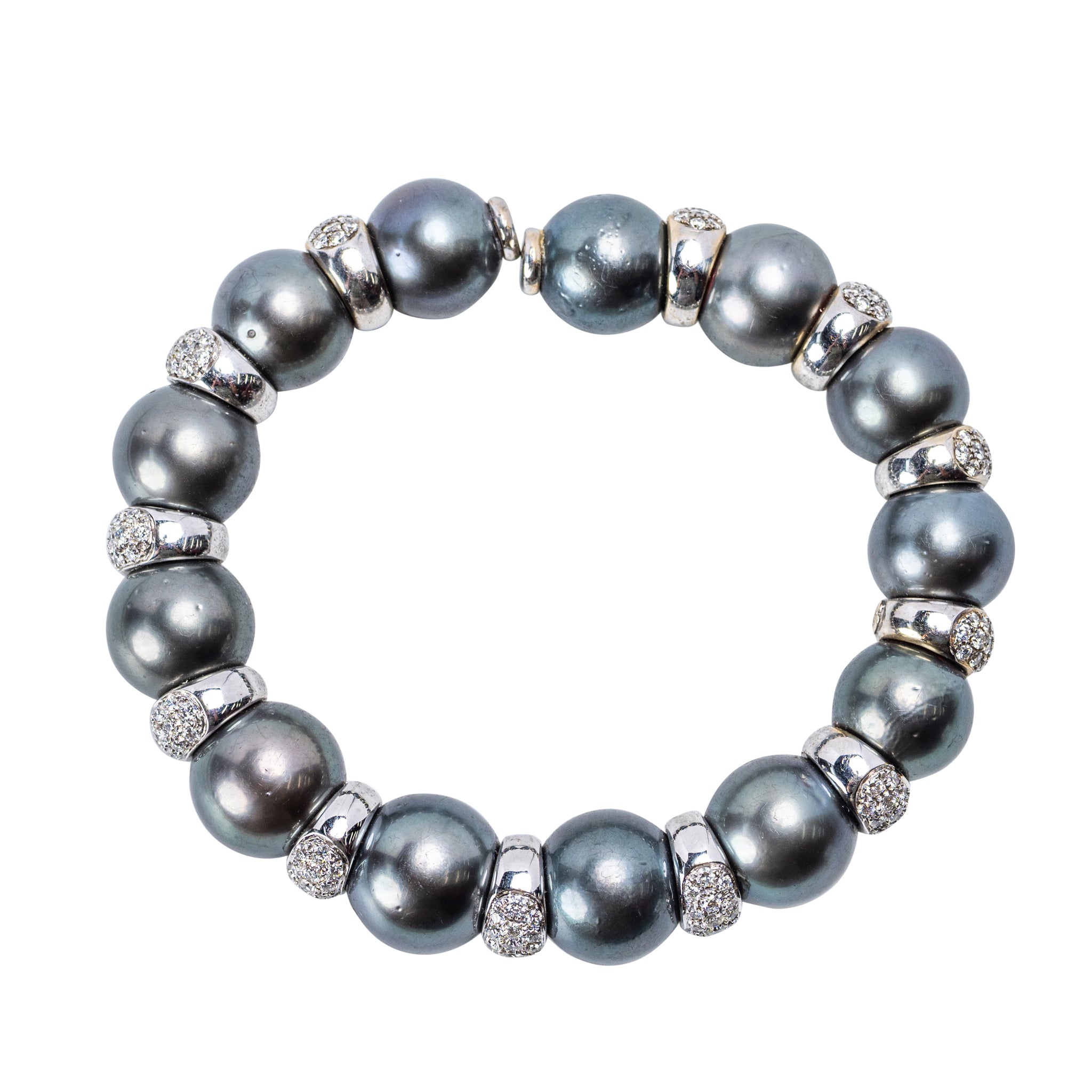 Tahitian Cultured Pearl and Diamond Bracelet Composed of thirteen large, lustrous gray Tahitian cultured pearls, each measuring approximately 13 mm, spaced by pavé-set diamond rondels mounted in 18 karat white gold. Diameter approximately 2 ½ inches; gross weight 78 g. Total diamond weight: approximately 4.00–4.50 carats, of fine near-colorless quality. Footnote: Bracelets of comparable design have been retailed by distinguished houses such as Yvel and Mikimoto, known for their use of large, high-luster Tahitian pearls paired with diamond rondels in bold contemporary mountings. specialist note: A luxurious bracelet featuring thirteen magnificent 13 mm Tahitian cultured pearls, each exhibiting deep gray body color with subtle peacock and silver overtones and superb luster. The pearls are separated by brilliant pavé-set diamond rondels, finely mounted in 18 karat white gold, creating a striking contrast between the soft sheen of the pearls and the sparkle of diamonds.The bracelet measures approximately 2 ½ inches in diameter and weighs 78 grams.