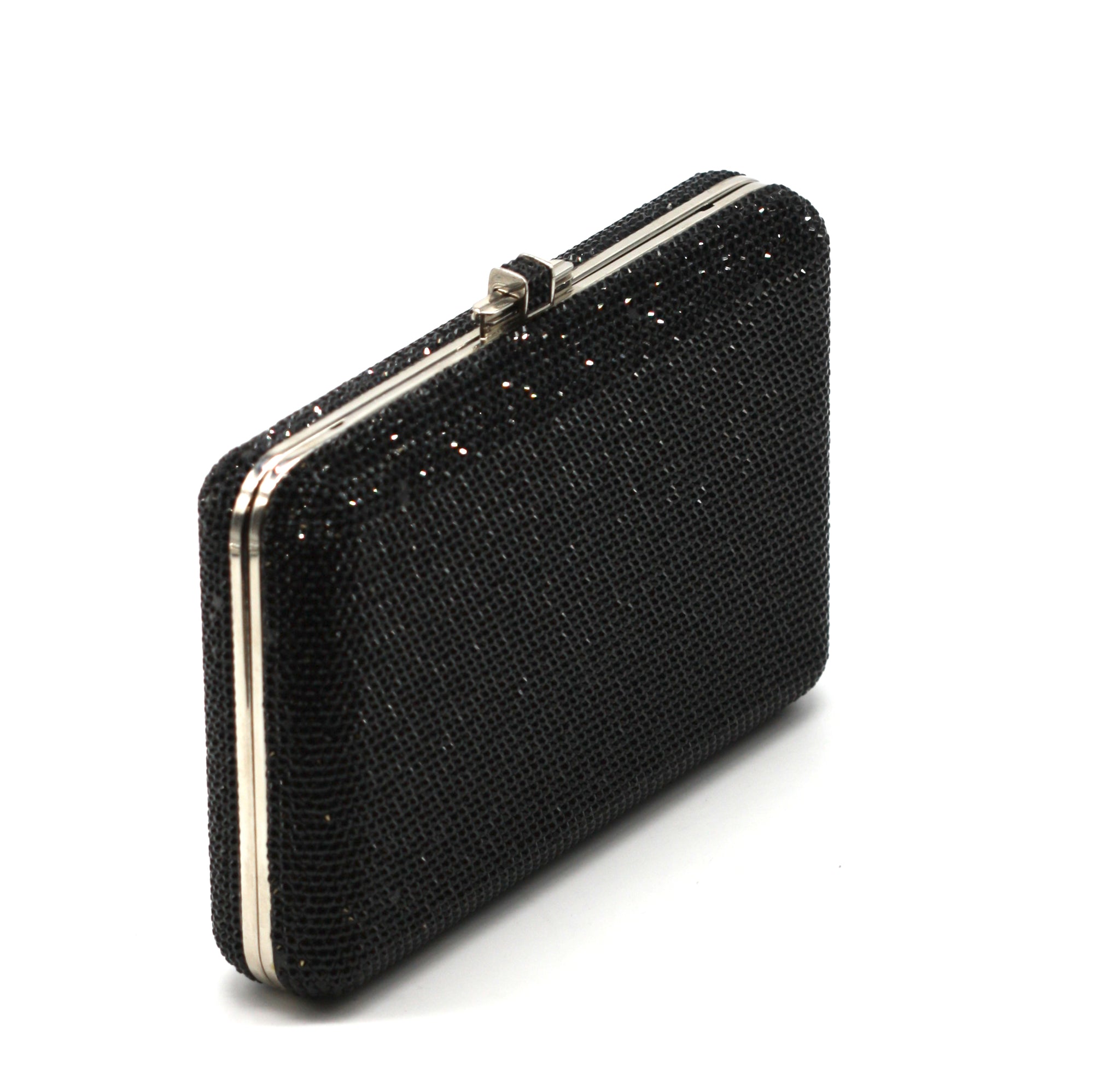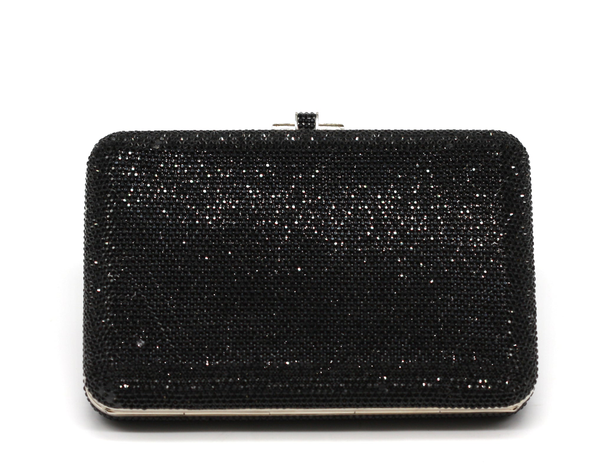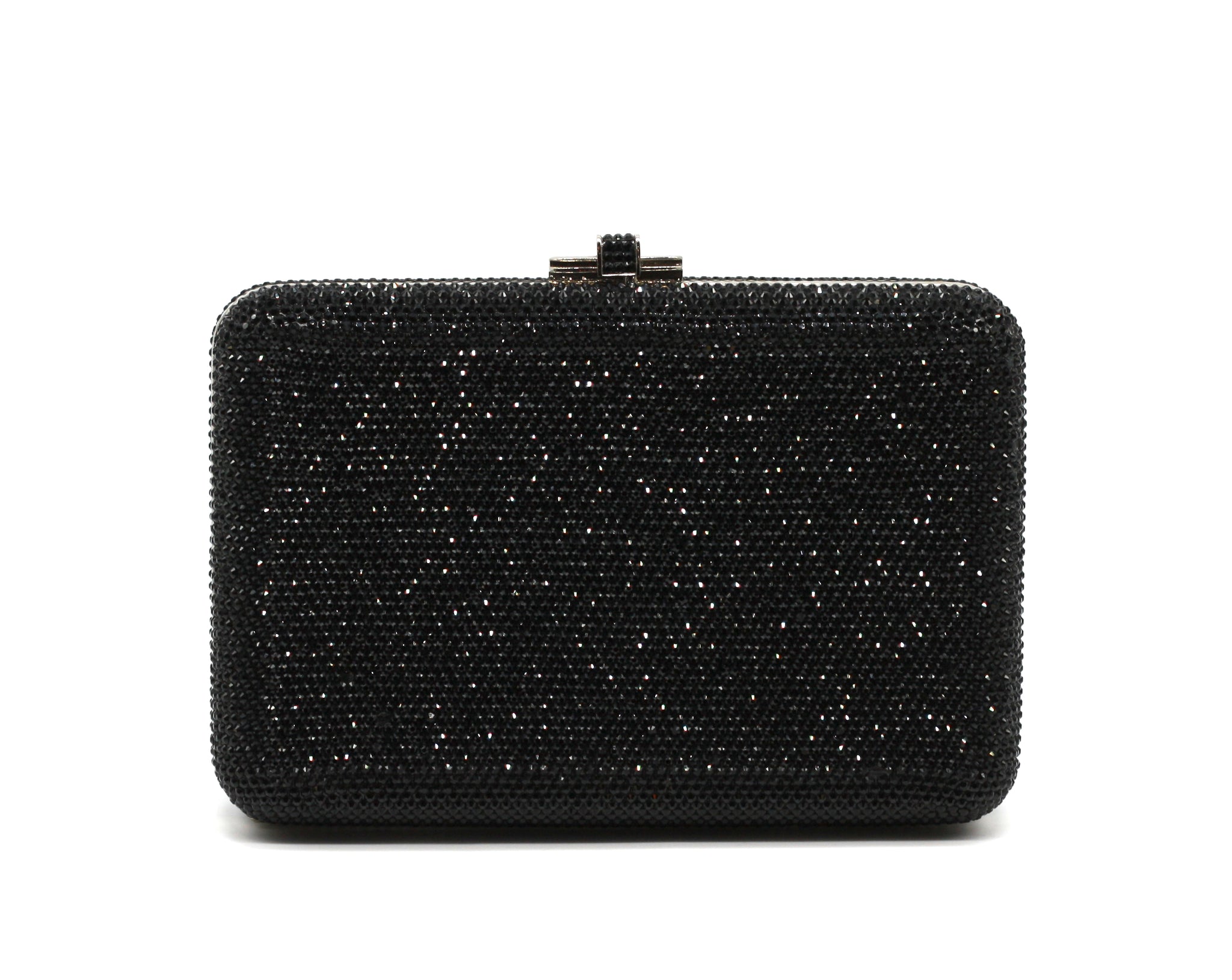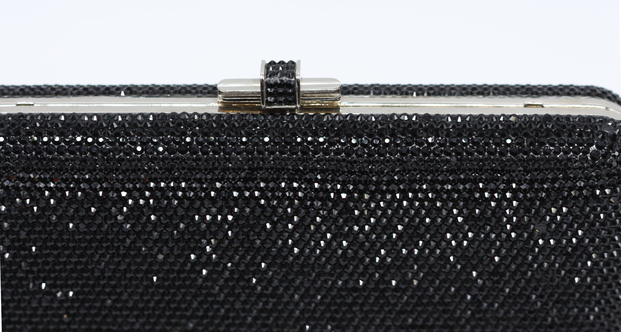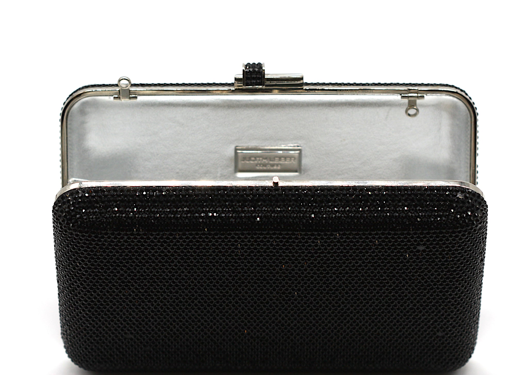 A sophisticated rectangular minaudière by Judith Leiber, rendered in sleek black with silver-toned hardware. The bag features a refined sliding clasp and a luxurious silvered leather lining, combining timeless elegance with modern allure. Measuring 5 x 7.5 x 1 in., this iconic evening accessory exemplifies Leiber’s signature craftsmanship and understated glamour.