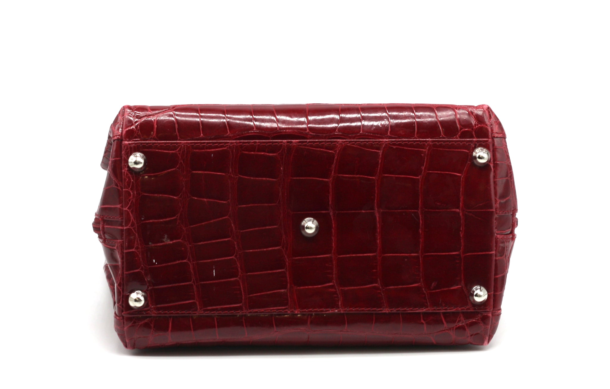 An elegant and rare example of Laurent Effel’s craftsmanship, this Ruby Red Alligator Handbag exudes timeless sophistication. The structured rectangular silhouette is fashioned from gleaming alligator skin, complemented by two conforming rolled flat handles. The interior, luxuriously lined in beige suede, features a central compartment secured with a double zipper and two magnetic side closures, creating a balanced three-section design. A central zipper pocket adds refined functionality.