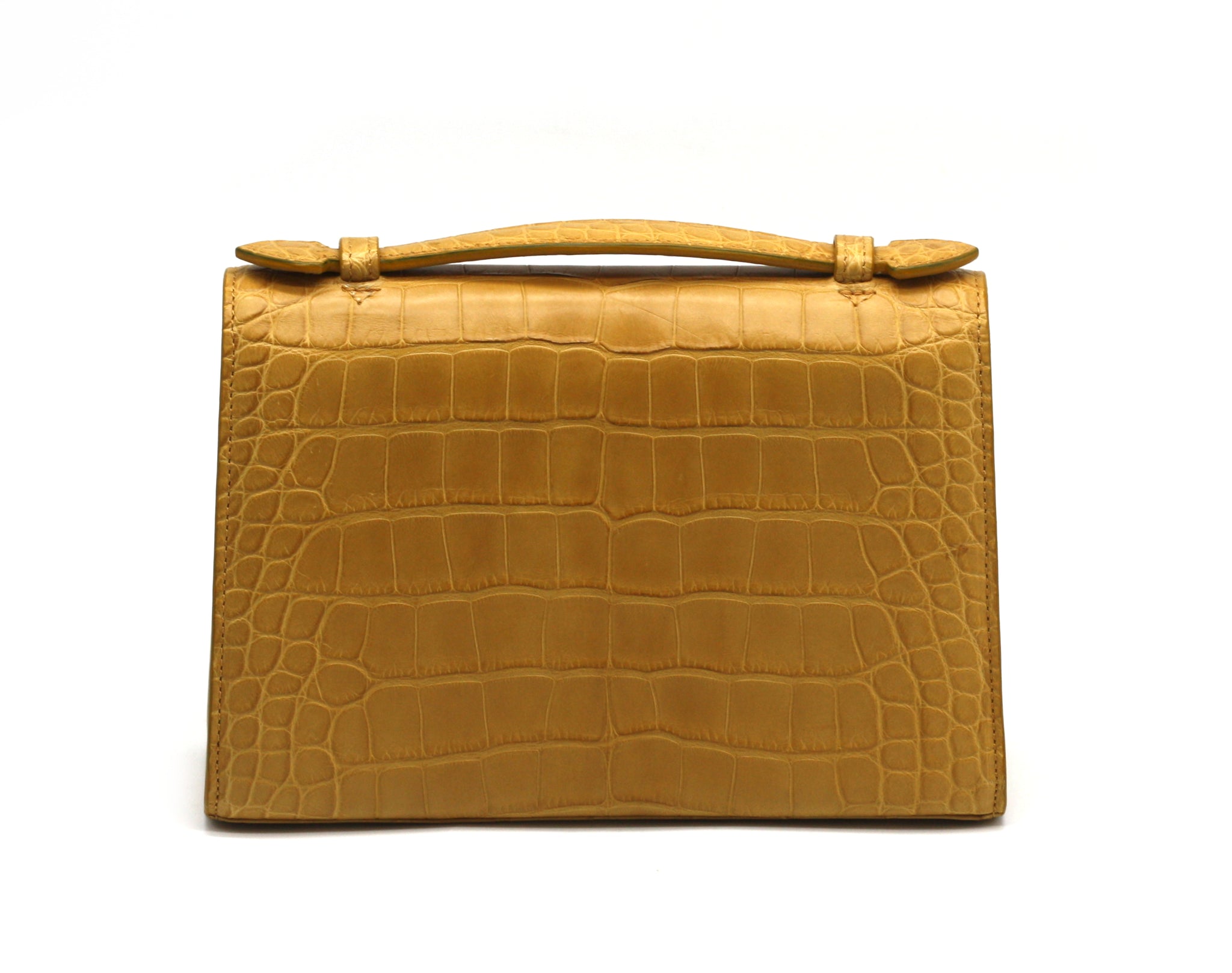 Rectangular in form, this vibrant piece is rendered in glossy Sienna yellow alligator, accented with a magnetic flap closure. The design features a discreet hand-hold, a leather-lined interior fitted with an open slit pocket, and is accompanied by a removable matching shoulder strap.