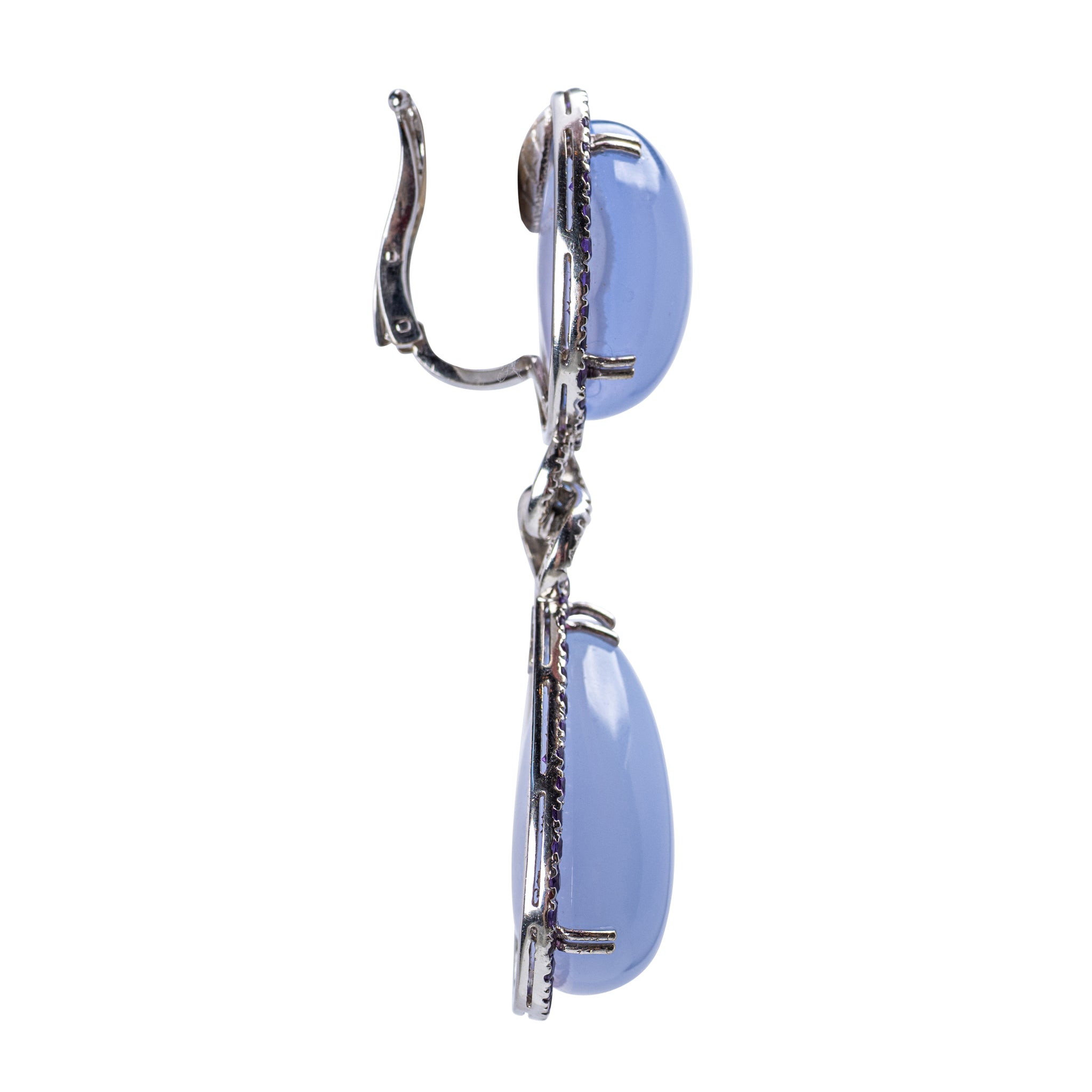 A striking pair of earrings by Sabadini, Milan, featuring luscious lavender chalcedony cabochons framed by round-cut amethysts and joined by pavé-set white diamond links.