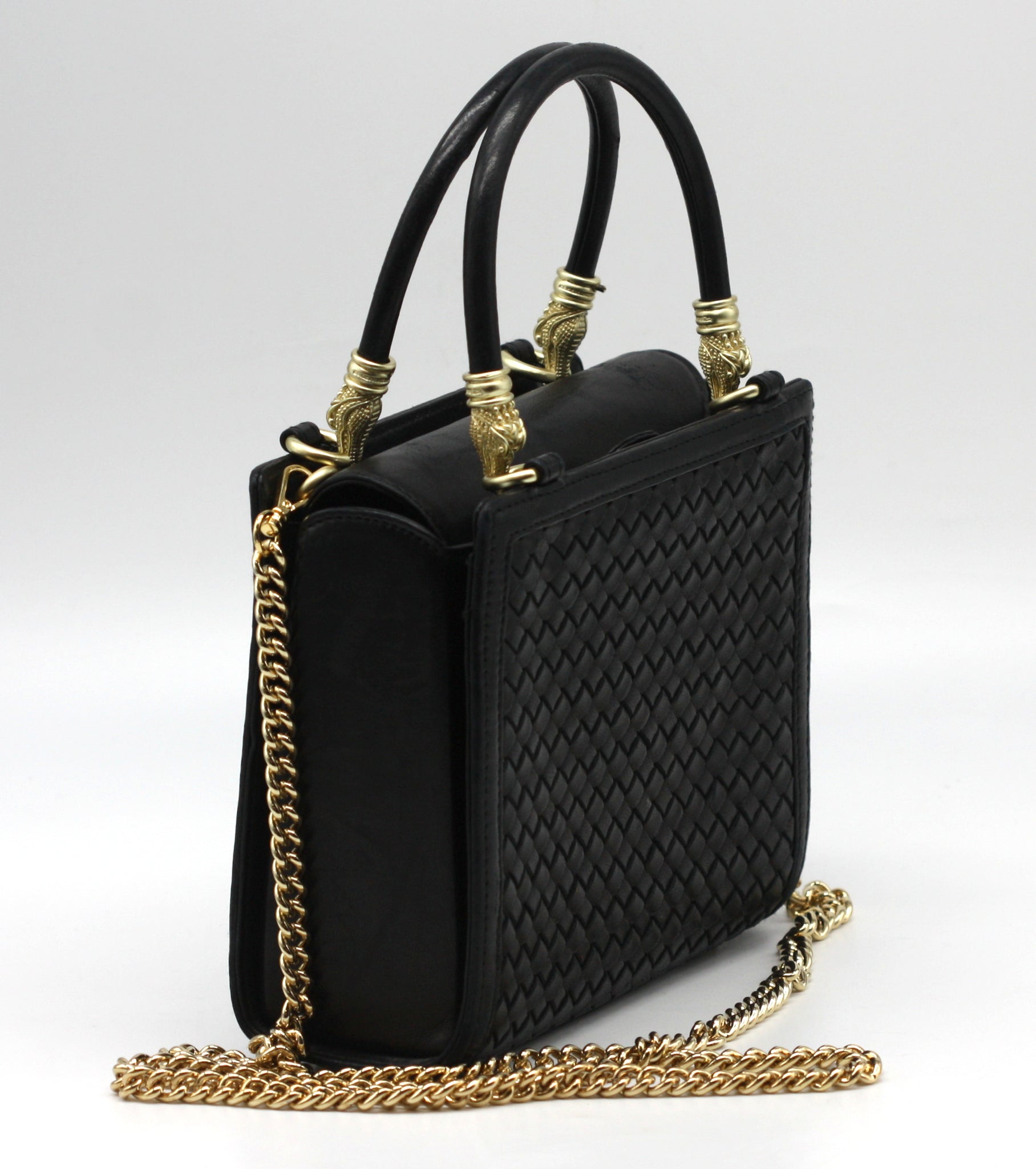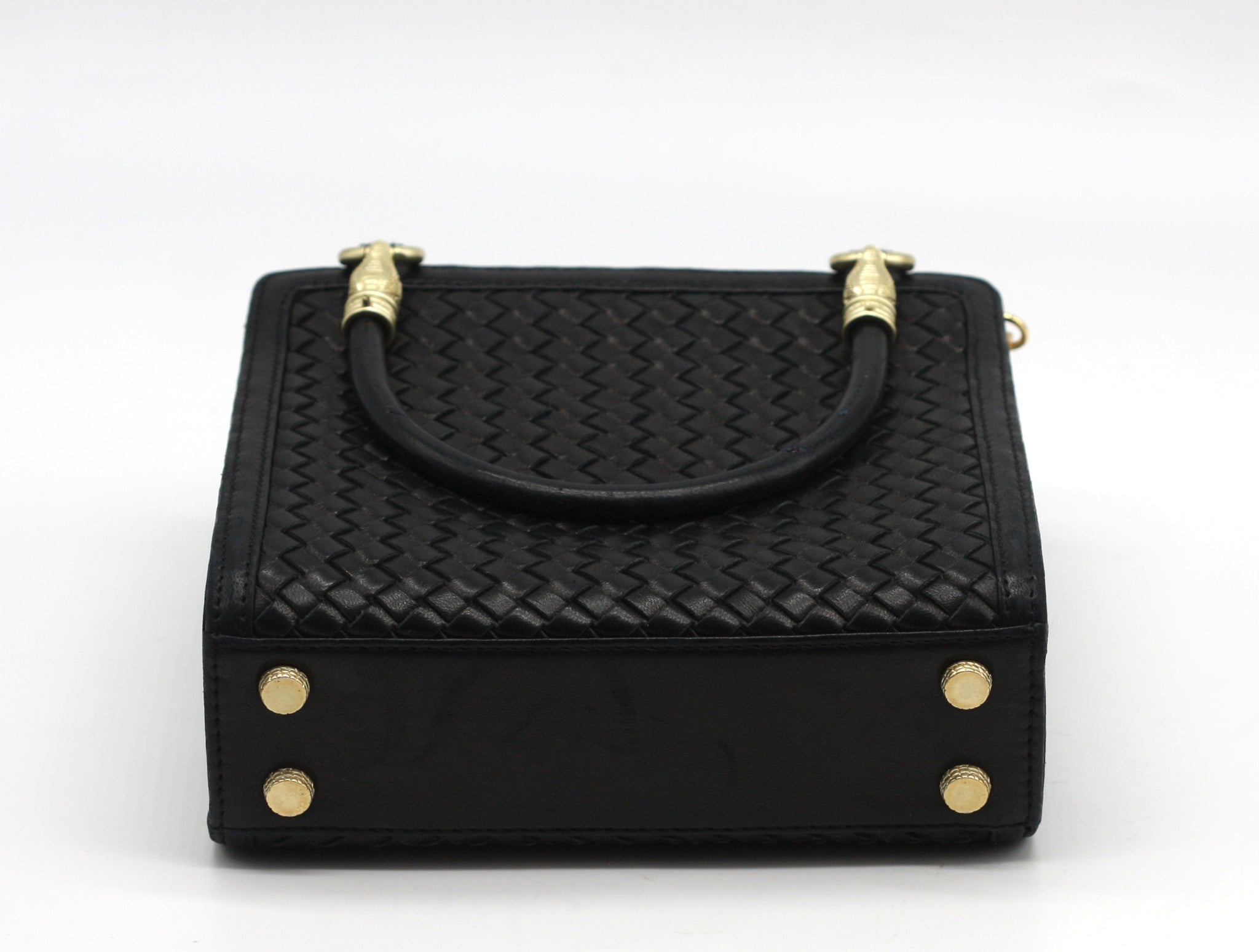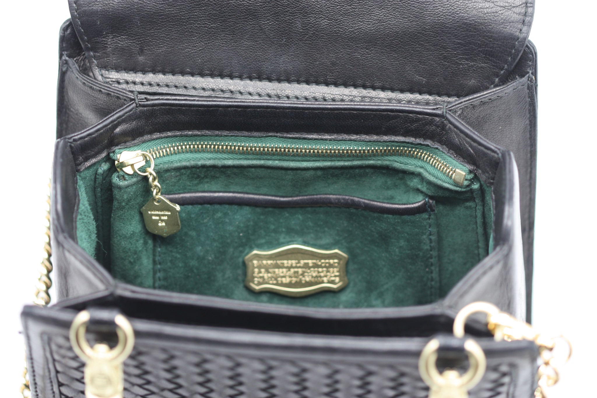 Barry Kieselstein-Cord Woven Black Leather Handbag An elegant rectangular handbag by Barry Kieselstein-Cord, finely woven in black leather and distinguished by double rolled handles. The matte gold-toned hardware, cast with crocodile heads, exemplifies the designer’s celebrated sculptural detailing. The interior, lined in green suede, is thoughtfully divided with a flap, zippered pocket, and open slit, while a detachable chain-link shoulder strap completes the design. Height (including handles) 10.5 in., Width 7 in., Depth 3 in. Condition: Excellent, showing hardly any use. |