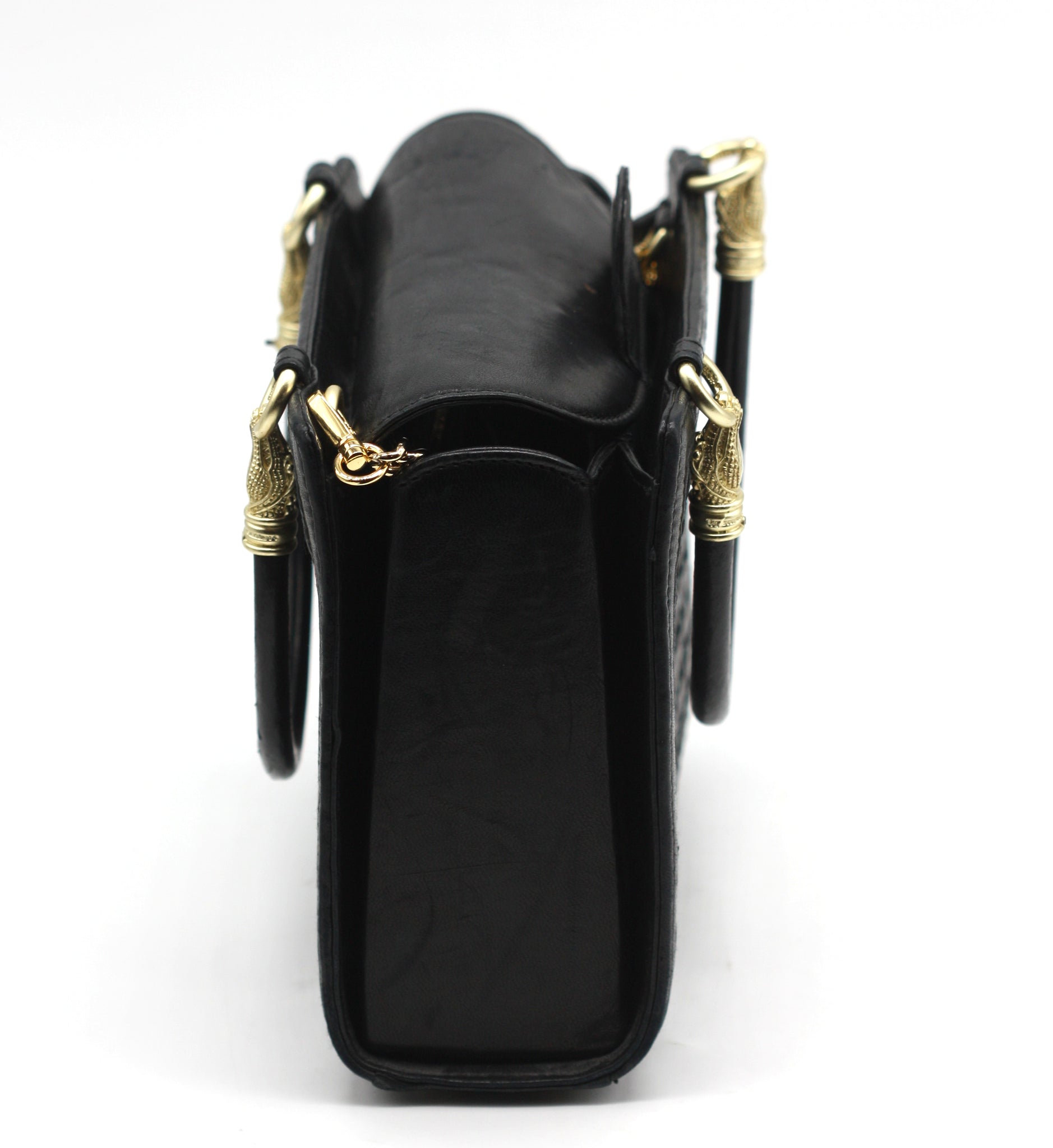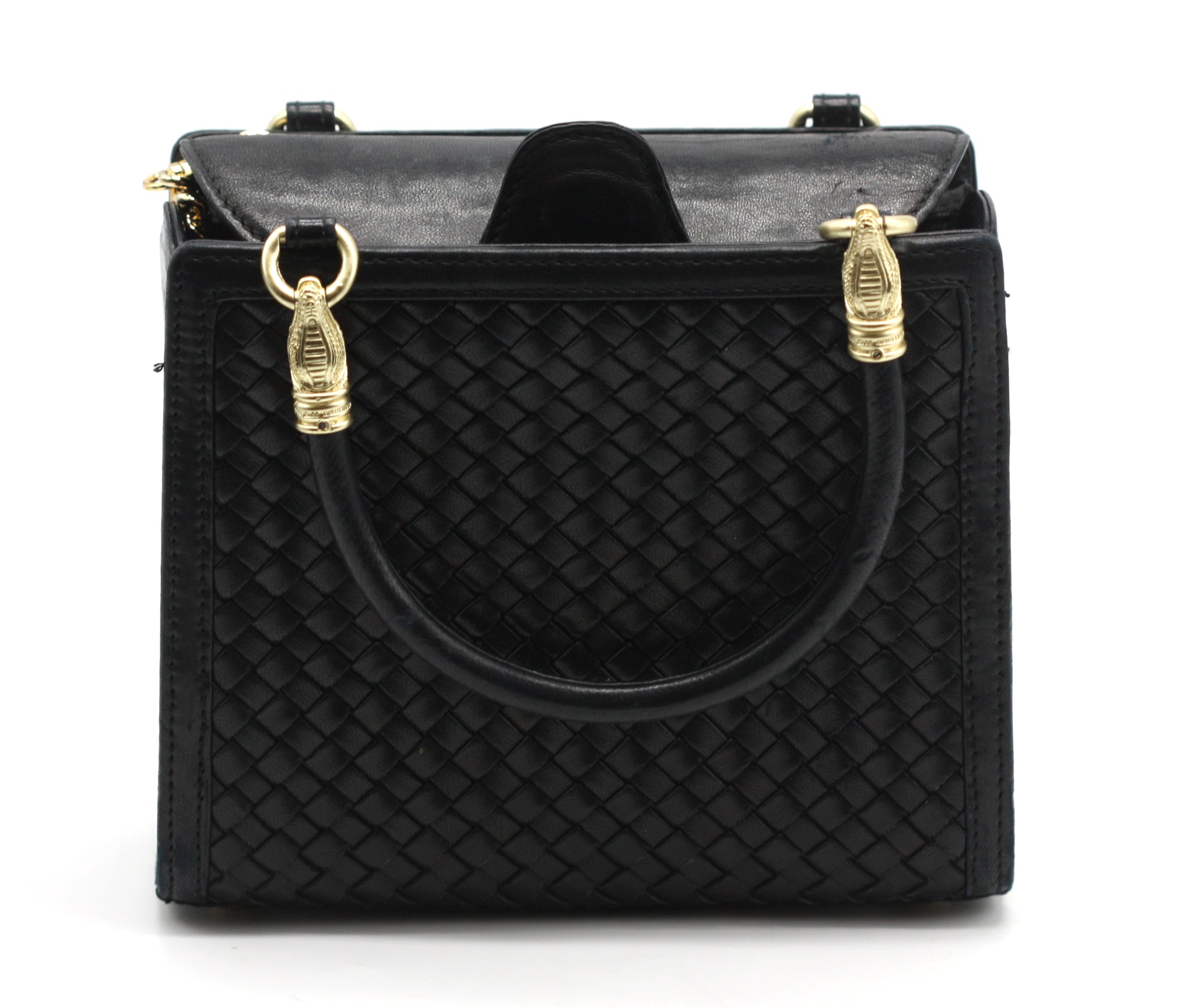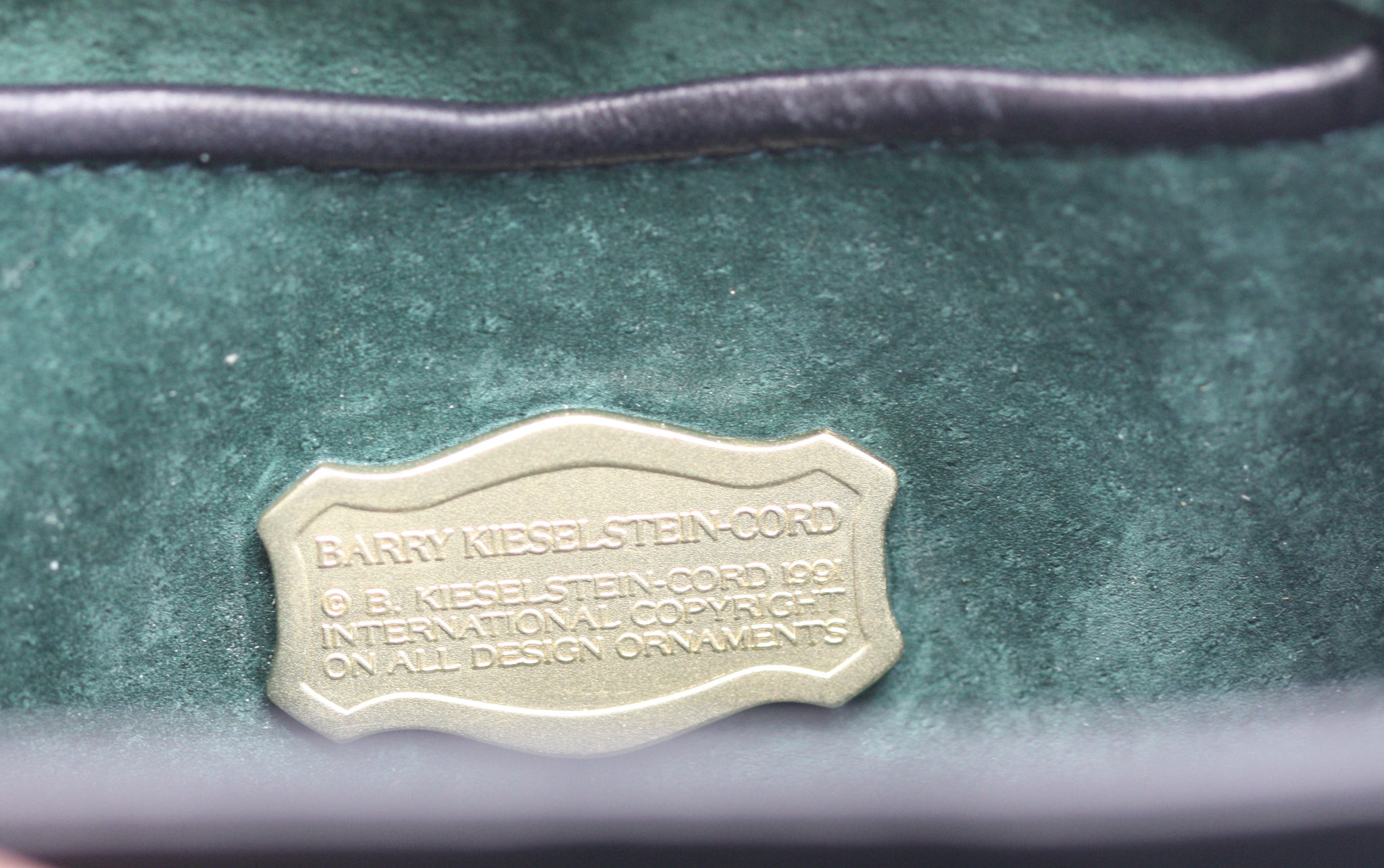 Barry Kieselstein-Cord Woven Black Leather Handbag An elegant rectangular handbag by Barry Kieselstein-Cord, finely woven in black leather and distinguished by double rolled handles. The matte gold-toned hardware, cast with crocodile heads, exemplifies the designer’s celebrated sculptural detailing. The interior, lined in green suede, is thoughtfully divided with a flap, zippered pocket, and open slit, while a detachable chain-link shoulder strap completes the design. Height (including handles) 10.5 in., Width 7 in., Depth 3 in. Condition: Excellent, showing hardly any use. |
